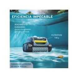 L'un des robots les plus efficaces et les plus puissants pour votre piscine vous attend, ne manquez pas le nouveau Robot nettoyeur Zodiac OF 4220 iQ Freedom pour piscines enterrées et hors sol de Gre. Profitez de toutes ses fonctionnalités, même à distance, grâce à l'application iAquaLink, qui vous permet de contrôler ses fonctions via votre smartphone. Avec la technologie « Tap&Lift » qui vous permet, d'un simple geste, de faire remonter le robot à la surface ! Connectez votre smartphone au robot nettoyeur grâce à l'application iAquaLink, qui vous permet de contrôler les cycles de nettoyage, de recevoir des alertes informatives, de régler le mode de nettoyage et de bénéficier de nombreux autres avantages. Le pack comprend : - 1 robot nettoyeur de fond OF 4220 iQ Freedom de Zodiac avec deux moteurs protégés, batterie lithium rechargeable, traction à chenilles, transmission par engrenages, système d'arrêt automatique à la sortie de l'eau, système de plage, filtre d'une capacité de 3 litres, système d'aspiration cyclonique, conception légère et très résistante, crochet de récupération du robot dans l'eau et câble de recharge pour le robot. Informations utiles sur l'article : - Âge recommandé pour son utilisation : + 16 ans. - Dimensions approximatives du robot nettoyeur de piscine : 30 cm de haut, 30 cm de large et 43 cm de profondeur. - Pour les piscines enterrées et surélevées jusqu'à 10 mètres de long et 5 mètres de large avec des parois rigides de toute forme, fonds et revêtements. - Zones de nettoyage : fond, parois et ligne d'eau. - Poids approximatif de l'article : 8,9 kg. - Niveau de filtration : 100 microns. - Couverture de nettoyage : 23 cm. - Surface filtrante : 480 cm².
